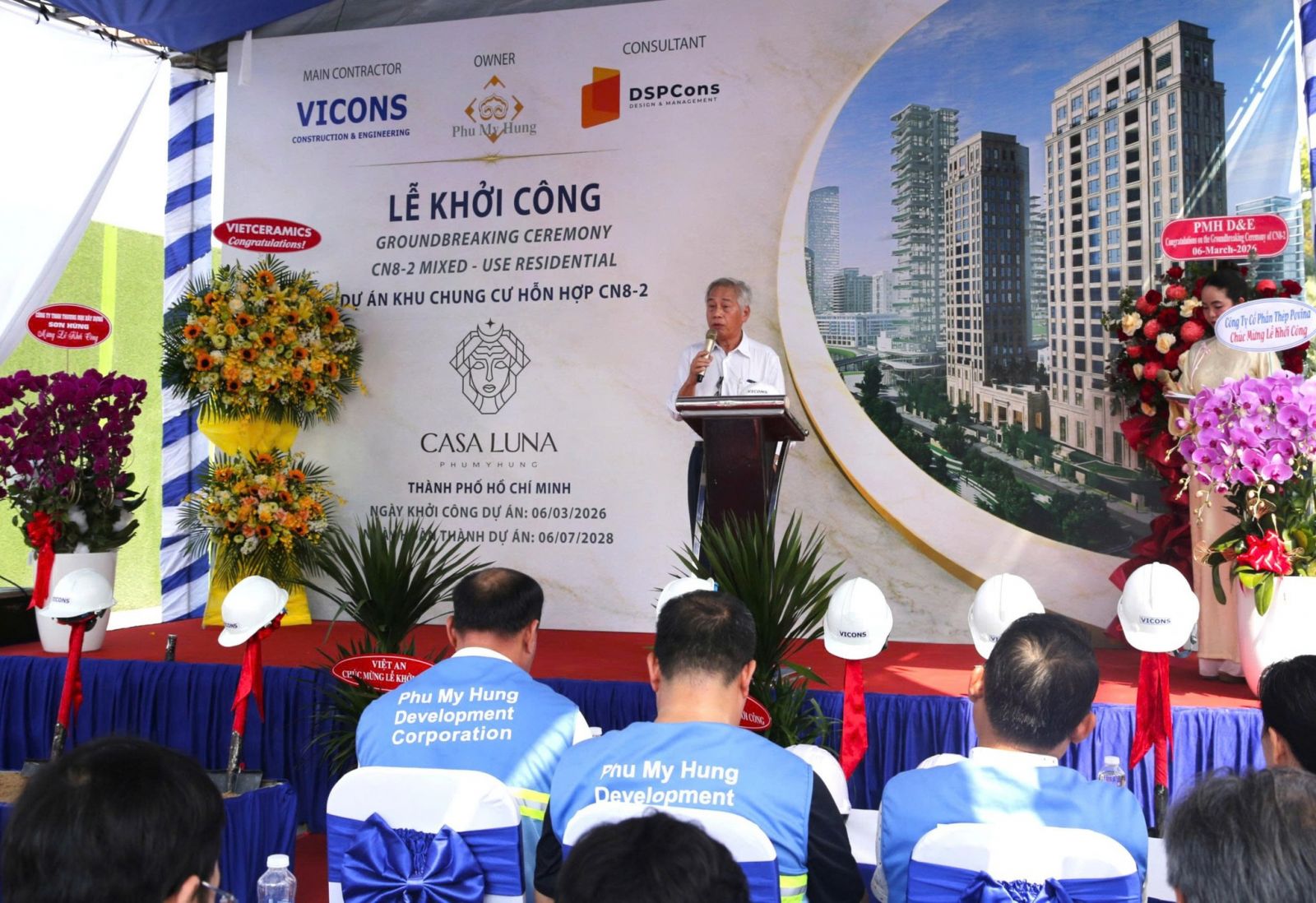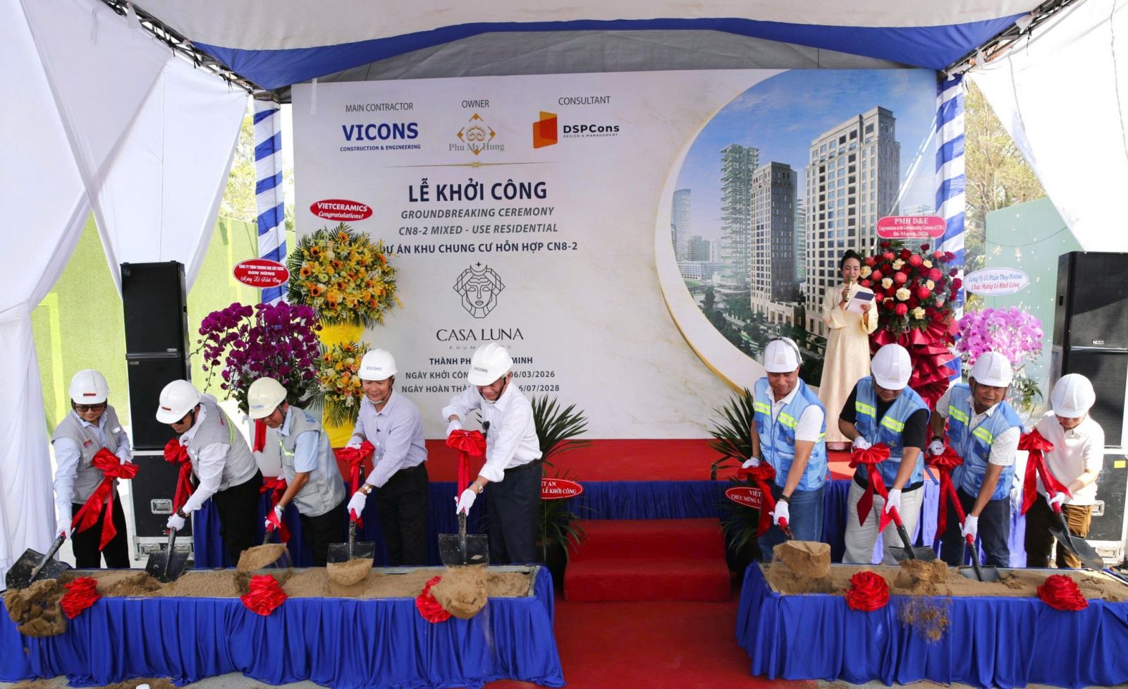 On the morning of March 6th, 2026, the groundbreaking ceremony for the CN8-2 – Casa Luna mixed-use apartment project was held. The project is located on Ton Dat Tien Street – Phu My Hung Canal Area, connecting to the Starlight Bridge, within the Crescent Lake area (Area A), bordered to the South by North-South Street, to the Northeast by Do Doc Tuyet Street, and to the Southeast by an internal road.